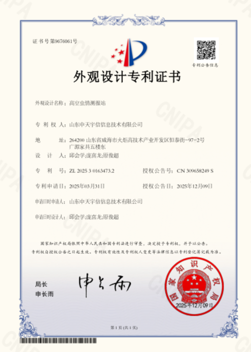 近日,国家知识产权局正式授予山东中天宇信信息技术有限公司两项外观设计专利 ——“高空虫情测报站”与 “气象测报站”,这两项专利的获批,标志着公司在智慧农业设备外观创新与工业设计领域的突破,进一步完善了产品知识产权保护体系,彰显了 “技术 + 设计” 双轮驱动的发展理念。